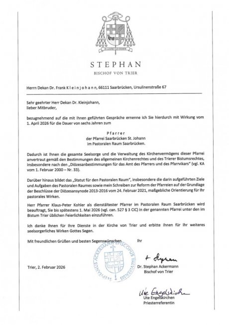 Mit Wirkung vom 01. April 2026 hat unser Bischof Dr. Stephan Ackermann Herrn Dr. Frank Kleinjohann, Dekan im Pastoralen Raum Saarbrücken, zum Pfarrer der Pfarrei Saarbrücken St. Johann ernannt.