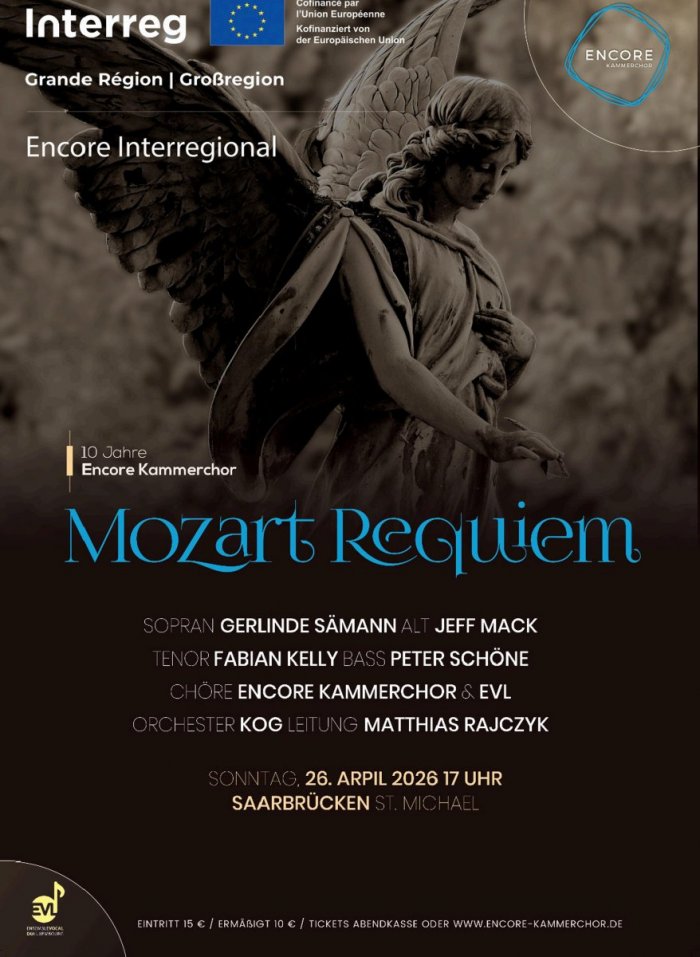 Am Sonntag, 26. April 2026, sind der Encore Kammerchor und das Ensemble Vocal du Luxembourg in der Kirche St. Michael in Saarbrücken zu hören. Das Konzert beginnt um 17 Uhr. Auf dem Programm steht das berühmte Requiem von Wolfgang Amadeus Mozart.